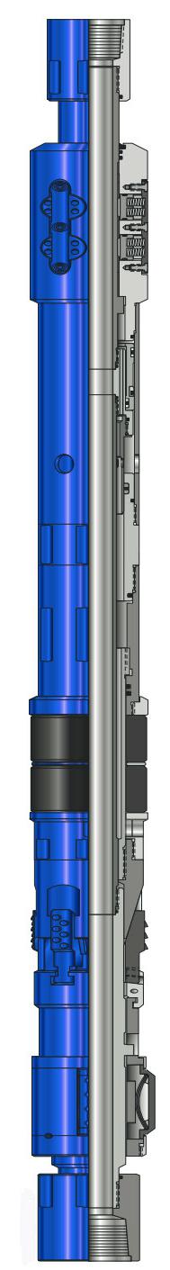 該封隔器是一種具有同軸旁通的懸掛式可回收封隔器。當工具進入井中時J型槽保持旁通打開,同時控制封隔器座封,當封隔器座封后,油管壓力驅動驅動平衡活塞,保持旁通關閉。